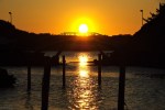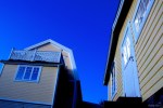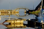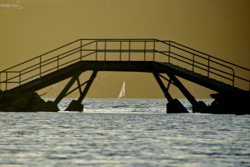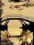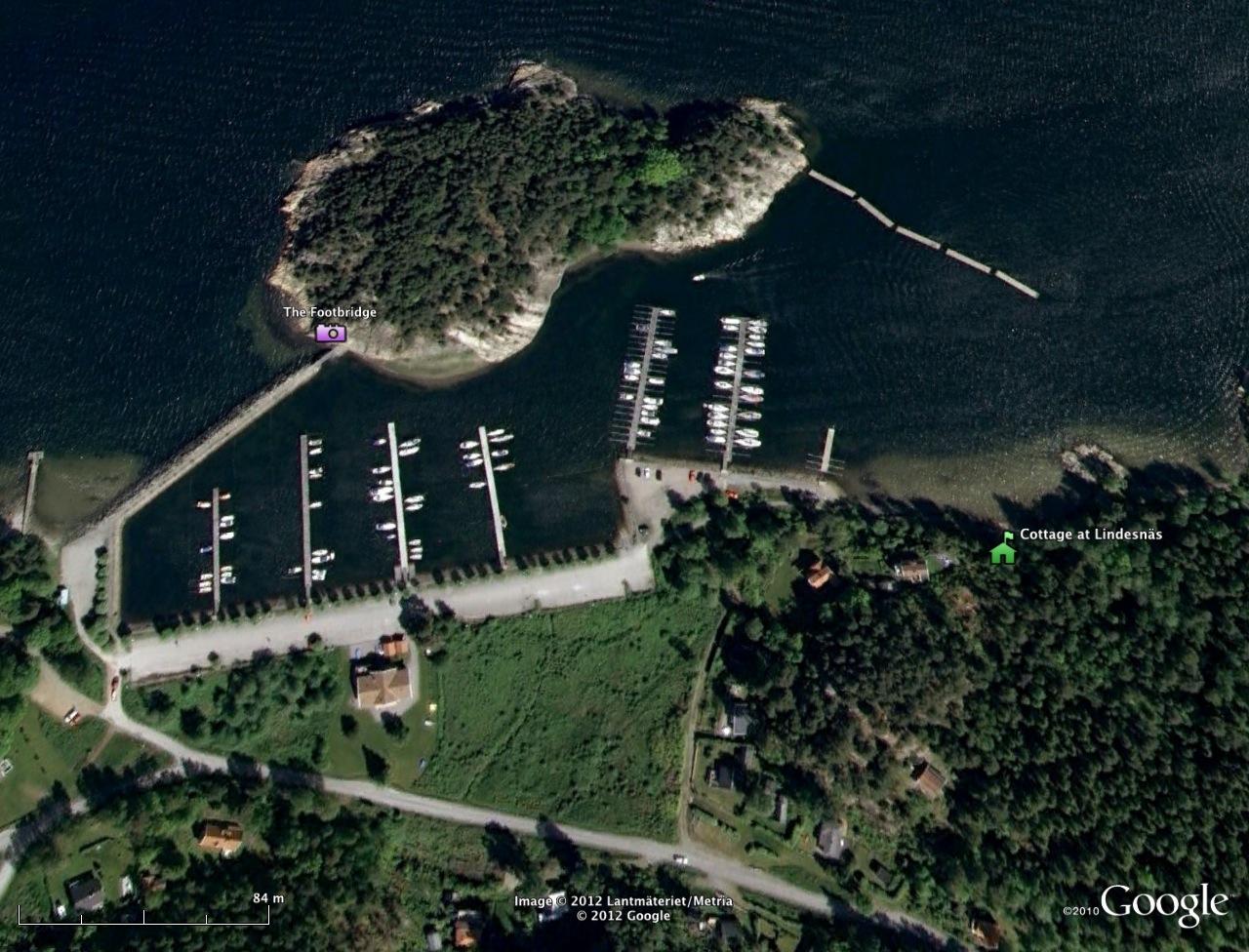 For three years I came to Sweden in spring and autumn and stayed in a tiny guest cottage at Lindesnäs. It was beautifully situated up on the hillside above the fjord right against the mountain side with lovely views down to the guest harbour at Lindesnäs. You can probably appreciate how nice it was from the map and the two pictures of the cottage. The first picture was taken as you emerge (in my case carrying my bicycle) at the top of the rocky steps up to the garden shared with the owners of the large villa. The second one is a long exposure taken one night with the cottage to the right and main house to the left. You can tell how steep the hill was by the distortion in the shot. The harbour below was always photogenic, especially at sunrise and sunset, and I was taken by the footbridge which became the subject of the rest of the pictures. The first is a zoom shot from the door of the cottage down through the trees. People tell me it looks Japanese. The others were taken either with the sun on the bridge (dawn pictures) or behind the bridge (sunset pictures).