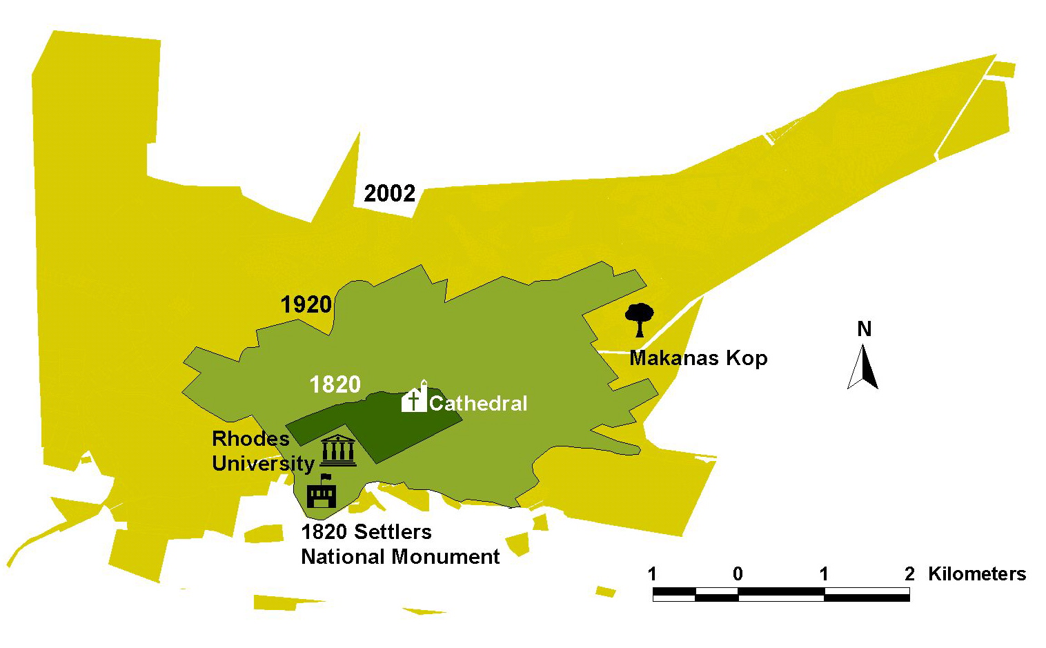 I used to have a website devoted to Grahamstown’s urban geography before Apple wrote off Mobile Me and support for iWeb. It described how the city grew, showed the segregation and apartheid areas and had pairs of photographs showing how the city has changed. All of those images are now in the gallery below. The Excursion Guide 2009 gives more explanation about the city, it is what we use when taking undergraduates around the town.