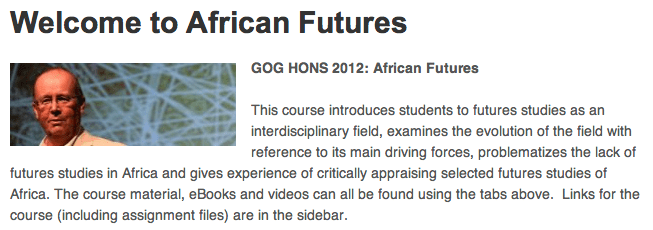 I was intending to set up the African Futures site next year but the move from Rhodes University’s Web Based Learning platform became urgent. RUconnected (Rhodes’ customisation of Moodle) has become increasingly unstable so I decided to spend a couple of hours setting up the new site before anything serious happened and I lost my material, course structure, links, embedded videos, eBooks etc. The big benefit is that the site is now open to anyone who cares to come by.