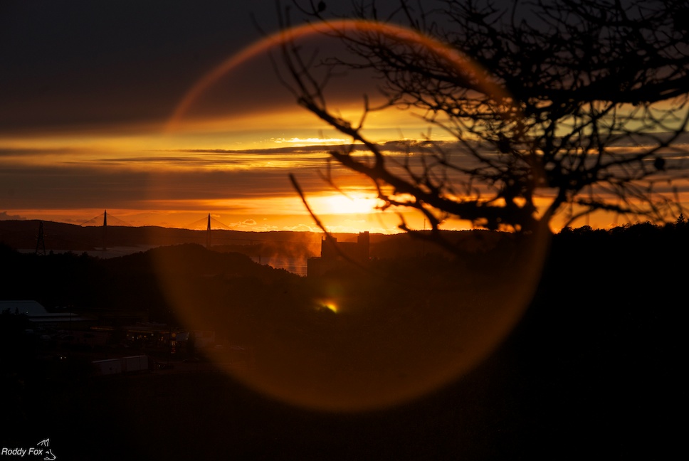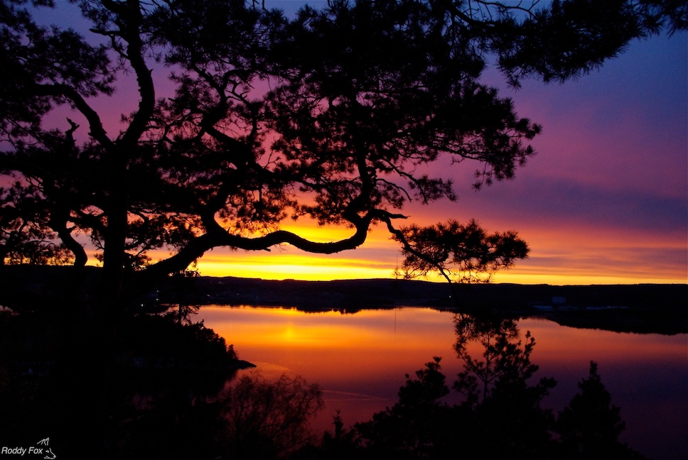Uddevalla is where I live when I stay in Sweden, a former industrial town set in lovely natural surroundings. That is the mix I am trying to show in these two pictures. The mid-October sunset is taken from above Skalbanksmuseet – the Shell Bed Museum – on the eastern side of town looking west over the city to the fjord and the silhouette of Uddevallabron. It was a cold grey afternoon when I walked over there from Äsperöd but just towards sunset the sun dipped out of the clouds. I had to run to get up the hill to catch the light. My hands were shaking so much I had to lie down in the cold grass to get this shot. By the time I got home I was in need of a quick malt whisky which soon put me right. The second sunset was taken in early May looking north-west across Byfjord. It was spectacular and a much easier picture. I had walked up to the viewpoint above Gustafberg and spent a happy half hour leaning against the tall rocks watching the light change. I will post some more of the same sunset some time as it was one of the most beautiful I have ever seen.