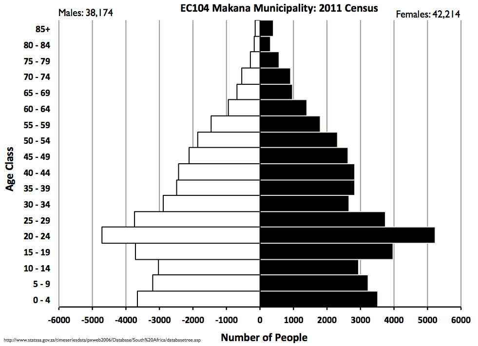 There has been a good deal of public discussion about the recently released 2011 population census and it is now possible to start to see some of the local level information. I downloaded the spreadsheet of age-sex information for all of the country’s municipalities from the website of Statistics South Africa. Then it was a relatively simple process to construct the age-sex pyramid for EC104: Makana Municipality – it is something that we do with our GOG102 Introduction to Global Development students though we have been using the data from 2001 census up to now.