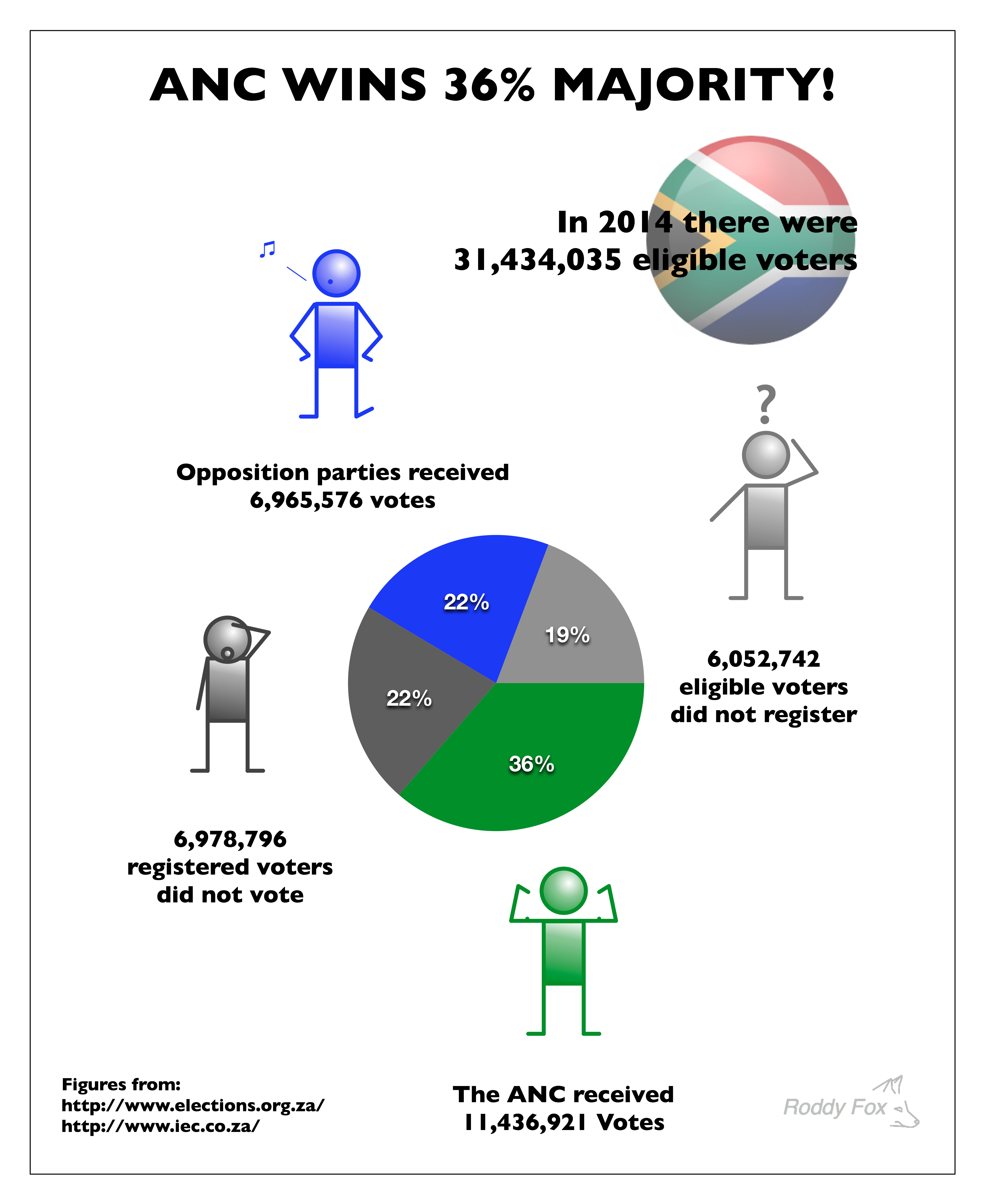 Here’s a different take on last week’s election …. a little arithmetic (using figures from the official IEC website) shows that the ANC’s 11.4 million votes is 36% of those that could, potentially, have been cast. Or to put it another way – over six in ten eligible voters did not vote for the ruling party.