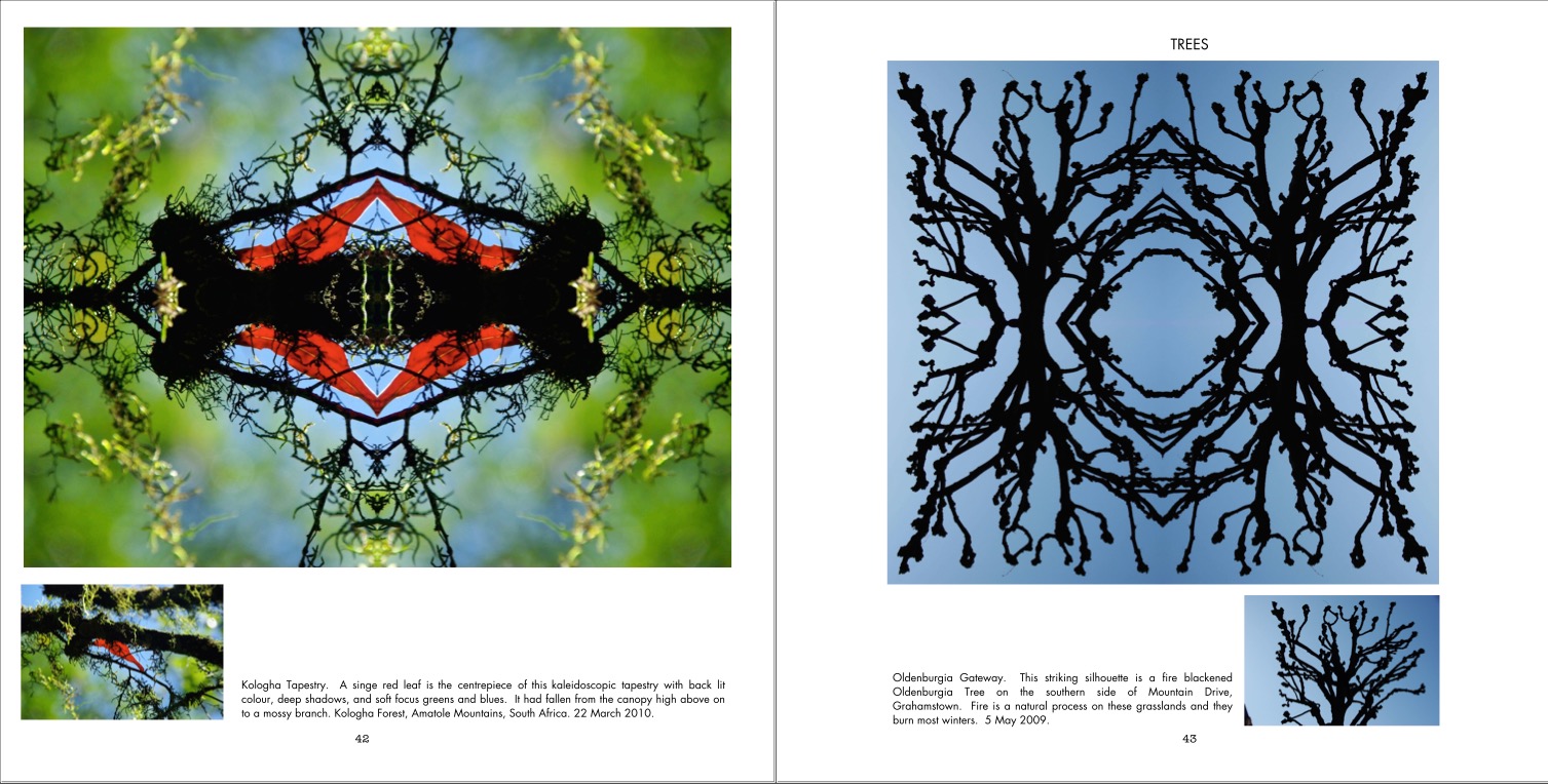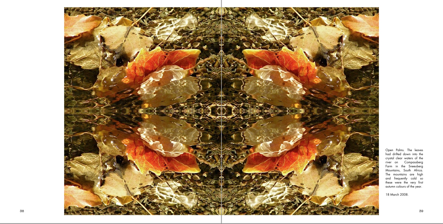 I realised that I am not the first person to construct striking and evocative imagery through mirroring and duplicating. What I have done in the book, though, is to add value to the pictures so that it is much more than just a set of lovely and intriguing images. The book is divided into seven sections depending on the aspect of nature involved. Then I have added a brief description for each picture and included one or two small photographs of people and places. Here is a two page spread from the Leaves section.