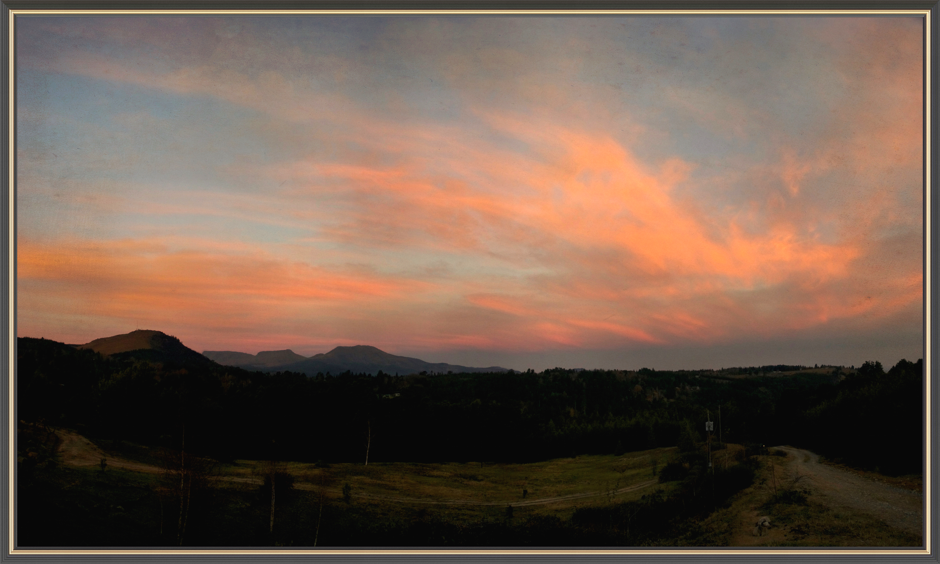 Last weekend was spent at my daughter Helen’s place high in the Hogback mountains. On Saturday evening we took the three dogs and Jeannie with the two little grandchildren up the hill for a sunset walk. It was quite a dark scene with soft light playing on the clouds above the mountains.