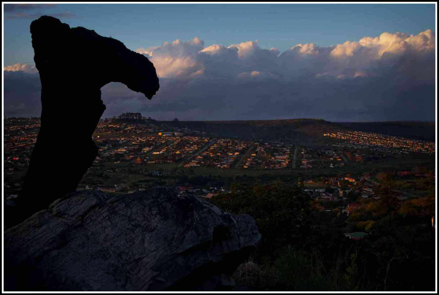 Makana’s Kop dominates the skyline over the township when you are down in the bowl where Grahamstown lies. There’s a prominent straggle of fir trees on its crown and the oldest townships of Fingo and Tantyi run down towards you as you look up to it from the city centre. This sunset picture’s taken from above city though, on the hillside next to PJ Olivier High School, so you look across the Belmont Valley to the Kop. It’s nestling in the crook of the burnt tree stump with the Old Municipal location, Ndancame and Vukani sweeping down the valley to the right of the picture. The last of the light is just catching the houses on the west facing slopes. It’s there that the full moon rises.
