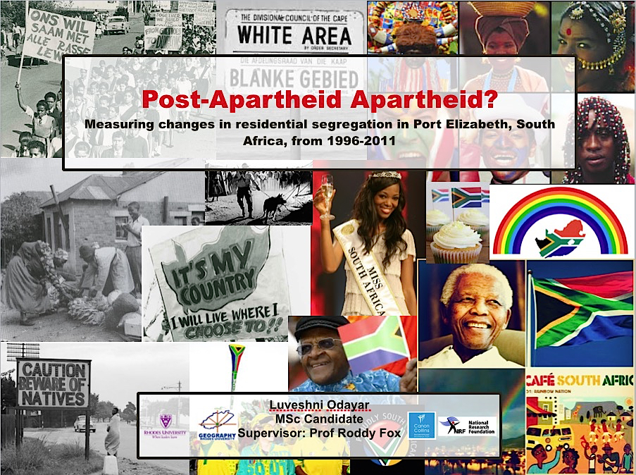 Her work asks whether the patterns of extreme segregation in Port Elizabeth have changed over the 20 years of the democratic era. She’s found that there has been a slow and continuous decrease but the city is still highly segregated. The African and White populations are the most segregated from each other as they lie at opposite ends of income, employment and education levels. Here’s her presentation.