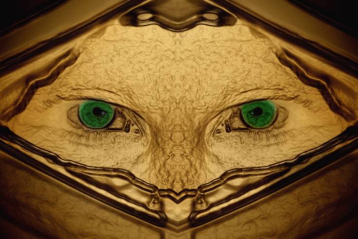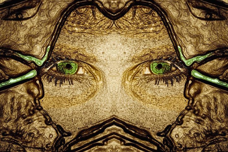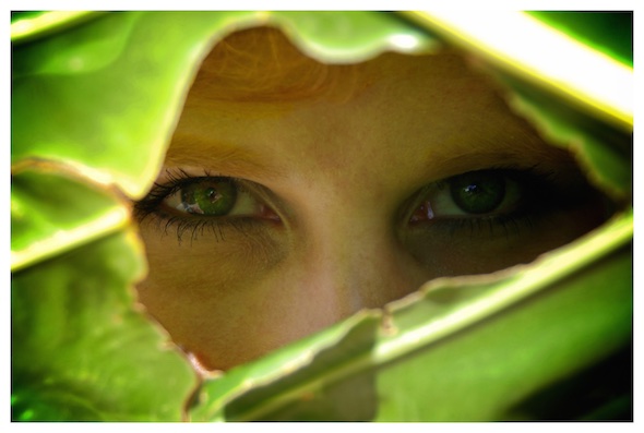 The first one is the original image. Two eyes are peering straight at the camera through the naturally torn membrane of a large lily leaf. The green backlight and shadows make the picture a little mysterious – it’s hard to see who the person really is and what she is enigmatically gazing at. The next two pictures are made from splitting the picture down her nose and duplicating each eye-half in turn. The duplicates are flipped over and joined to its mate. So the next pictures are actually of two right eyes and two left eyes. I’ve filtered the images using FX Studio PRO to get the striking textures and colours.