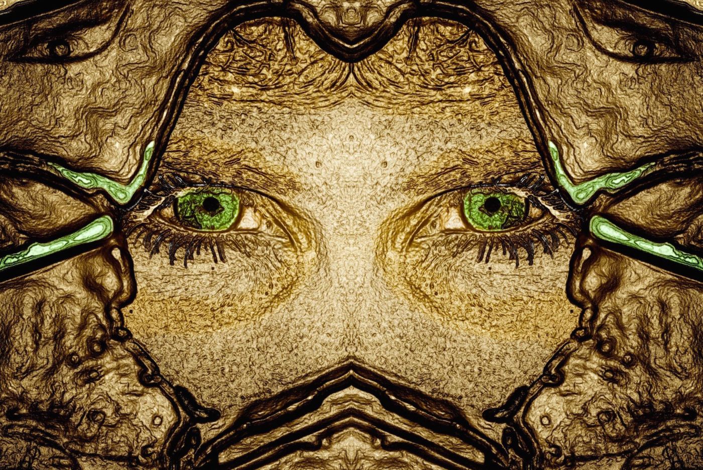 The first one is the original image. Two eyes are peering straight at the camera through the naturally torn membrane of a large lily leaf. The green backlight and shadows make the picture a little mysterious – it’s hard to see who the person really is and what she is enigmatically gazing at. The next two pictures are made from splitting the picture down her nose and duplicating each eye-half in turn. The duplicates are flipped over and joined to its mate. So the next pictures are actually of two right eyes and two left eyes. I’ve filtered the images using FX Studio PRO to get the striking textures and colours.