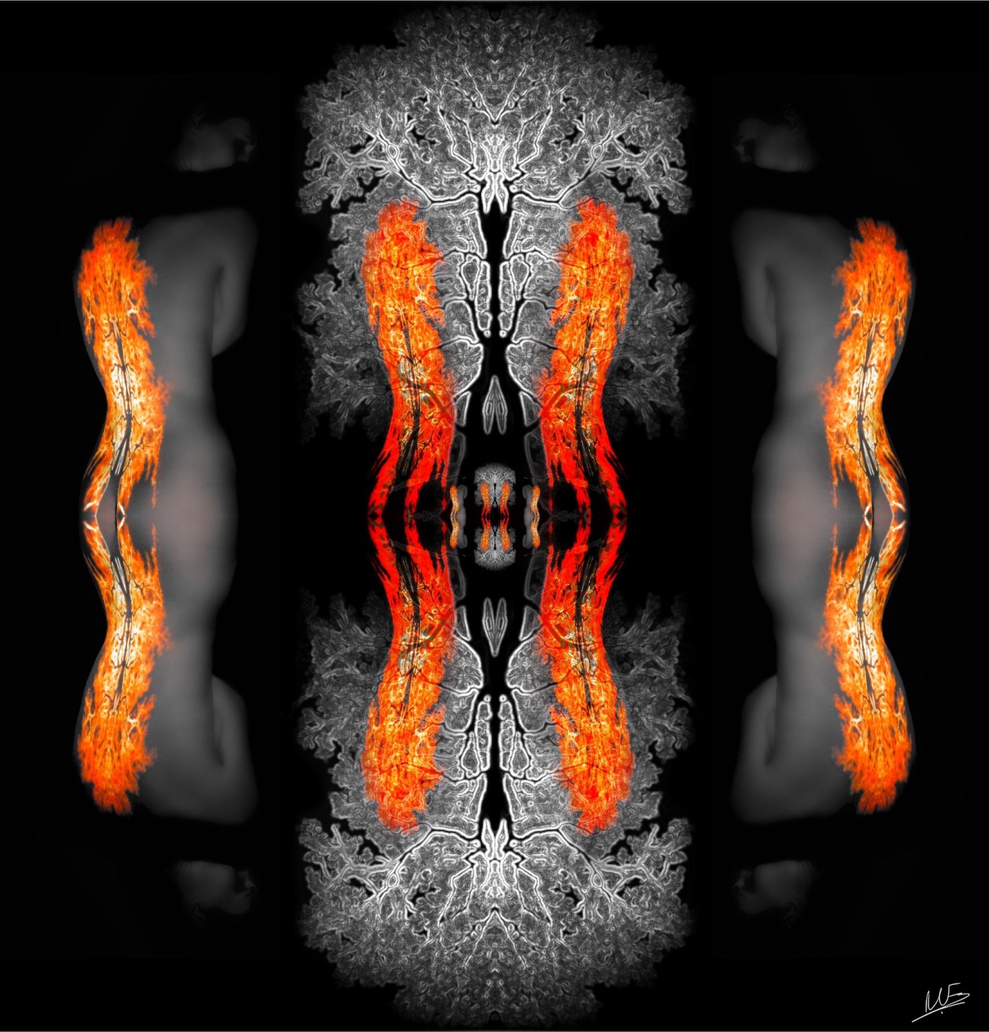 ‘Angel Wings’ and ‘They look like something from William Blake’ were the first responses I got to these pictures. They’re a little different to the other triptychs because there’s no background image, the runic tree is compressed to run up Natalie’s spine. It really does look like the wing of an angel. So I copied and then mirrored her image, superimposing them on top of the original runic tree to get this dramatic triptych.