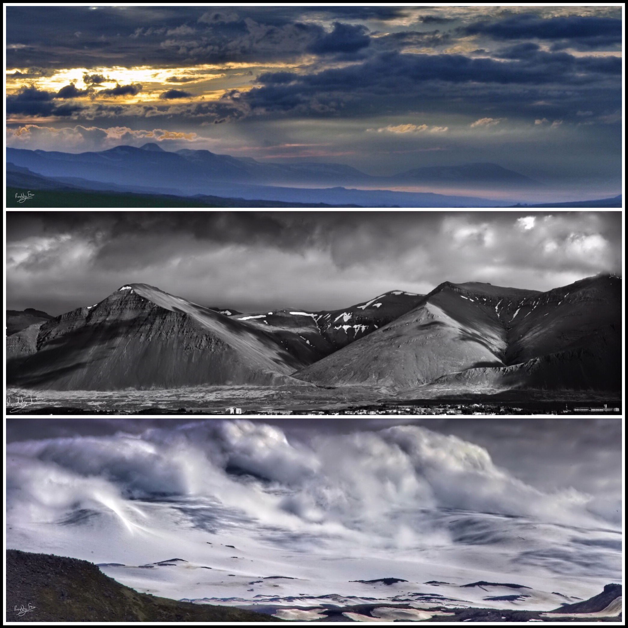 Iceland has such a big dramatic landscape that you struggle to fit it into a regular sized photograph. I tried a number of panoramic shots when we were there in the summer of 2013 and I’ve recently come across them again whilst reorganising my photo files – so I’ve done some touching up on them. My camera doesn’t have a fancy piece of software to make a panorama so these are all made from separate, overlapping, frames stitched together using DoubleTake. It wasn’t a sunny road trip and it was very windy sometimes so these shots were snatched whenever it was possible. The top image in the composite is looking north at 11pm watching the sun dipping slowly towards the horizon. We were up in North-West Iceland at Skagafjörður. The middle image is the view of Borgarnes just as you enter the town from the west. The bottom image shows clouds peeling off the icecap at Snæfellsþjökull.