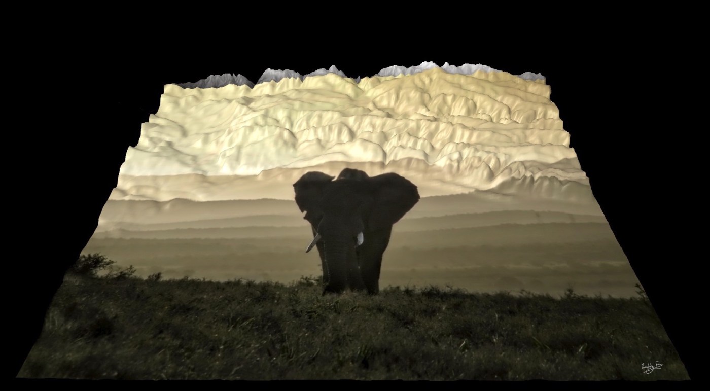 I got to wondering what would happen to my picture if I draped it like a tablecloth over a three dimensional elevation model of the Addo area – showing the elephant embedded on the landscape it lives in. It wasn’t easy to get the image looking aesthetically pleasing and on the right part of the landscape but here’s the result.