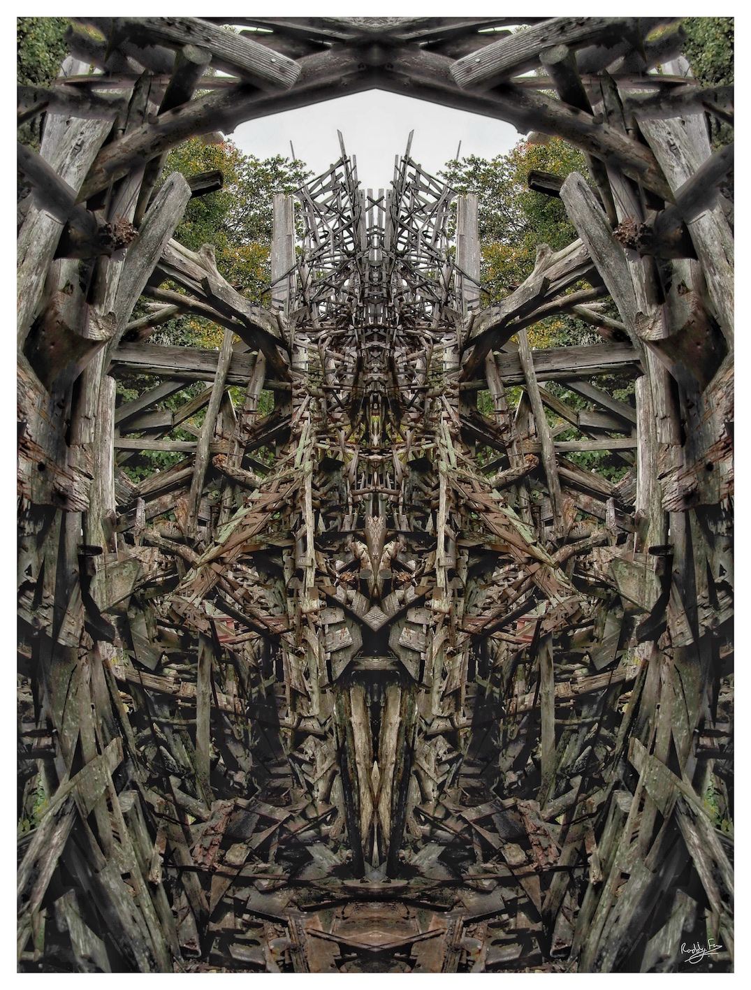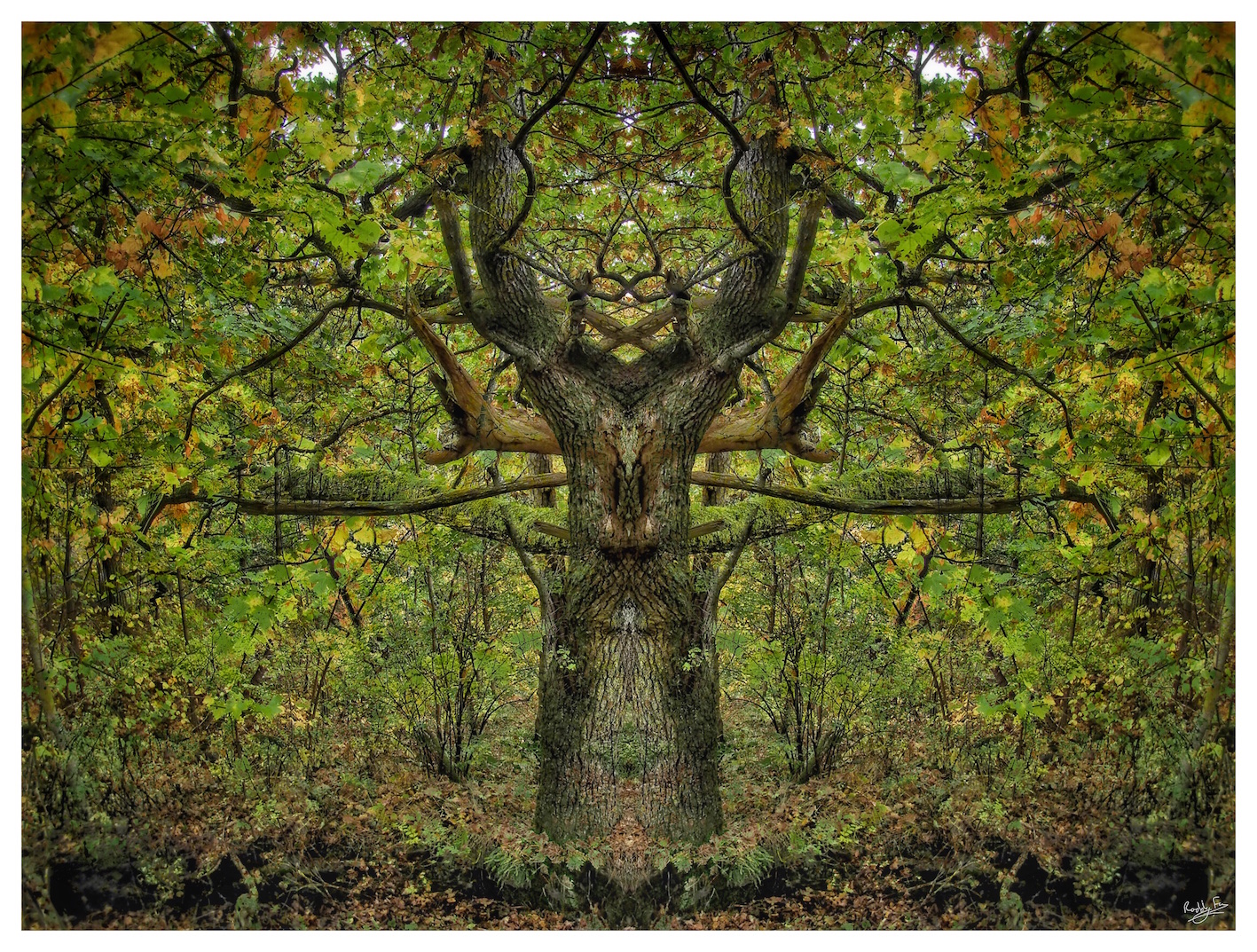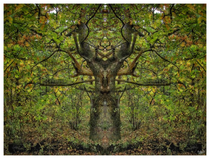 This image’s of an oak (ek) tree showing the first autumn colours and I’ve used the identical processes of mirroring and overlay on it. The foliage is far more dense and so the image is much more richly textured.