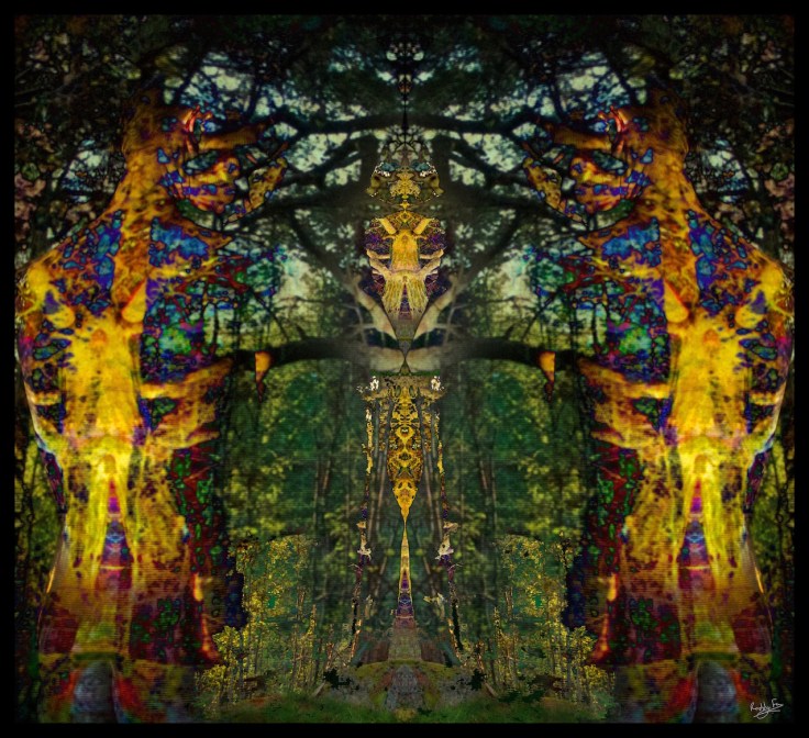 Lastly I did something quite fantastical. I made Dryad Fantasy by overlaying the runic tree with the Angel Dryads in a multiplicity of mirrored images. So it’s a re-composition of the originals: re-imagined shapes with new patterns and forms.
