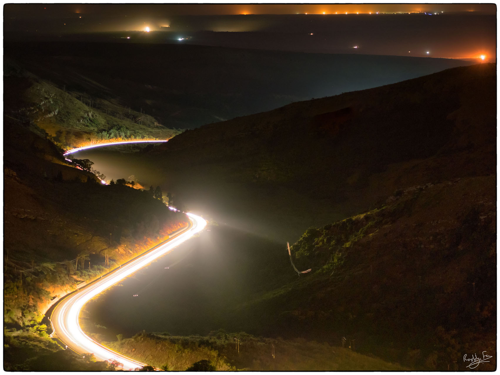 The N2 at Night makes a good photo essay. From the radio masts on the western end of Mountain Drive you can catch the car headlights coming up Howieson’s Poort. At the toposcope you can look down over the N2 bypass to the town’s lights. Below you is the Port Alfred road and the N2 weaving across the Belmont Valley and up through the cuttings beyond.