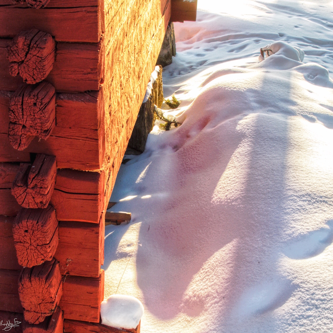 I had to use a very wide angle lens to capture the sky and clouds in these scenes. Even with the sun at a low angle the Falu Red is vibrant. If you are lucky and there are no clouds then you can get red reflections in the snow.