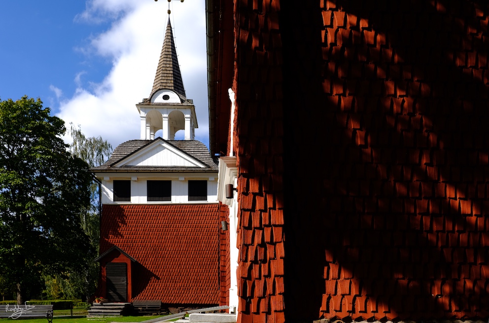 In dappled summer light it’s still soft but with brighter and darker red patches where there’s light and shade. You can see this on the main church building at Sunburn that has a large oak tree spreading shade across the roof and walls. Sundborn church is a beautiful village just outside Falun with a lovely heritage walk that features the locales of Carl Larsson’s famous paintings. The church is part way round the walk.
