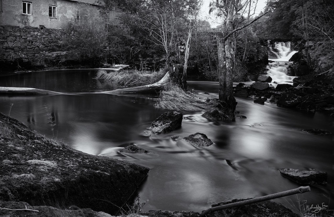 You couldn’t get much more of a contrast than with this next image. It’s taken late one evening after sunset and it’s a view of the Bäveån that flows through Uddevalla. The river has a series of old mills along its course and this one hunches above a broad sweeping curve with the rapids in the background.