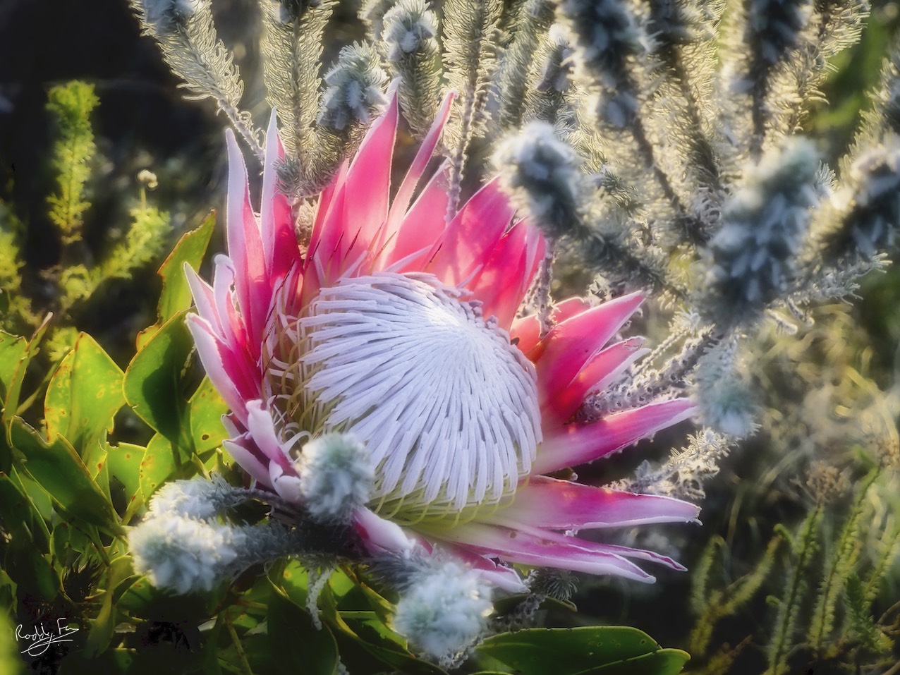 There are some King Proteas blossoming on Mountain Drive at the moment. Though they are not as many as last year – when they seemed to go on flowering for a very long time. As Spring gets nearer the days are getting a little longer so there’s just a bit more time to photograph them. Sunset’s a great time for this. I wanted to make a few studies showing them in different light and these four pictures are what I have got. They were all taken in the early evening – often straight into the light so a lens hood was essential!