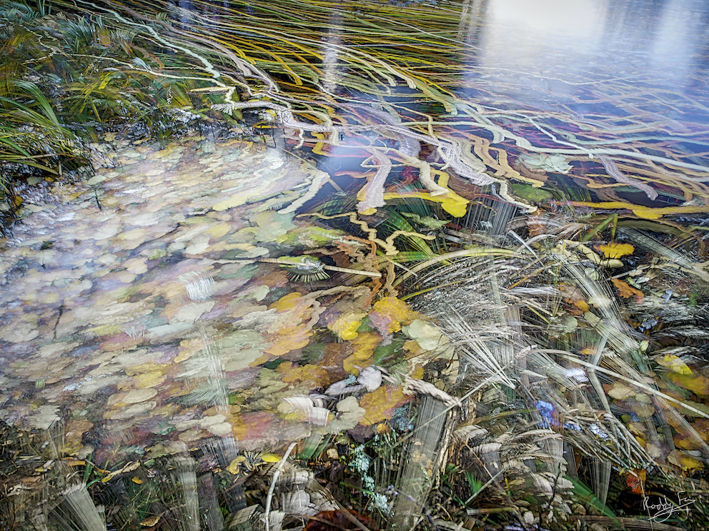 The rushes in the foreground are blurred in motion whilst the river, full of autumn leaves, flows smoothly around the curve behind. The sky overhead is reflected in it and the bank of trees behind completes the composition. I’ll describe at the end just how I used the Live Composite mode on my Olympus to do this. But first some more riverscape impressions.