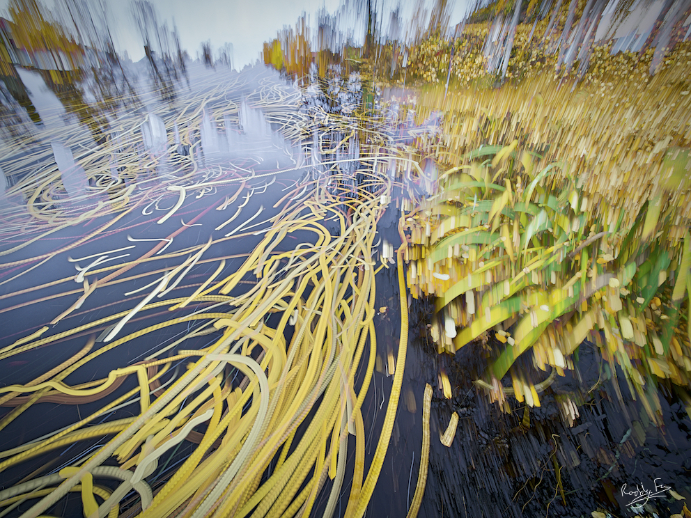 The last picture is the most abstract. It’s taken looking down into the water and it would be difficult to work out what you were looking at if you hadn’t seen the other pictures already. I think it looks like it’s been painted with oils and then the grasses added in with a palette knife.