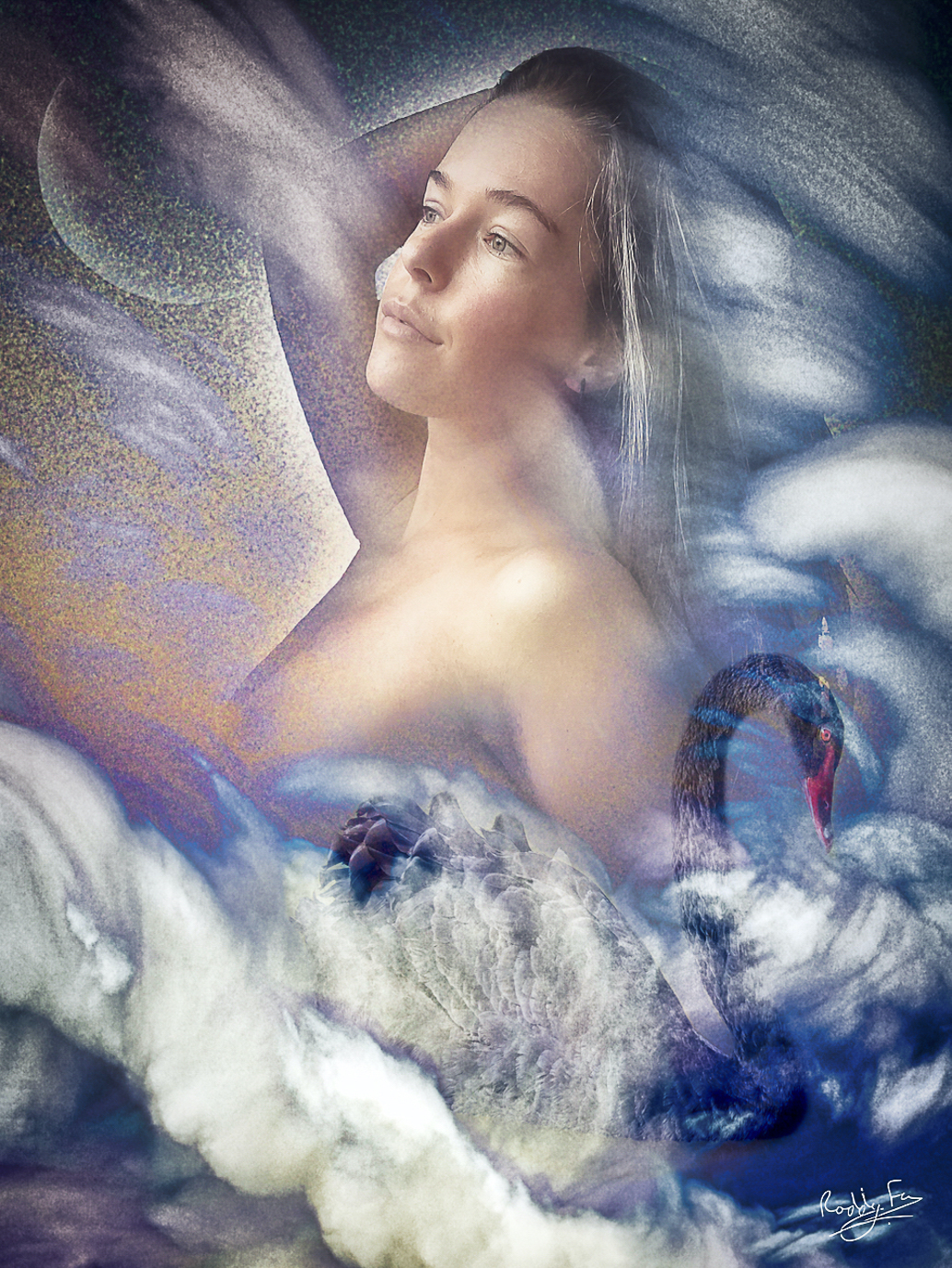 In one of the selfies she’s looking wistfully out of her window so I took that as my base portrait for the Black Swan. I masked out the domestic interior of her place and then added four or five overlays to get the final image you can see here. I wanted a magic realism kind of effect and think the Black Swan floating in the clouds gives the right, slightly surreal edge. If you compare it with The High Priestess you’ll see that it’s got a much softer tone than my other work with her.