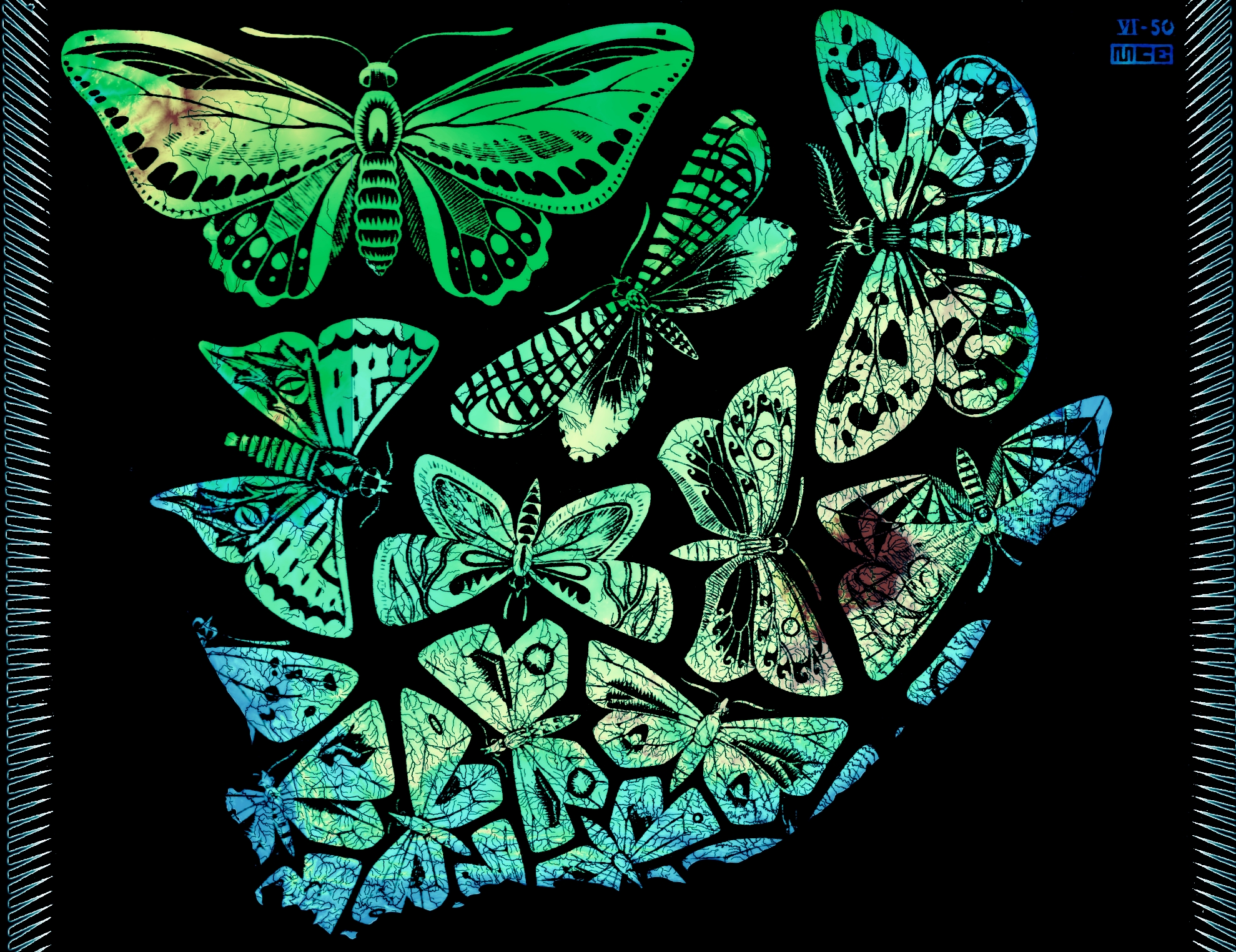 So I scanned The Butterflies from my 1972 copy of The Graphic Work of MC Escher and then removed all of the white areas from the print leaving those areas transparent.
