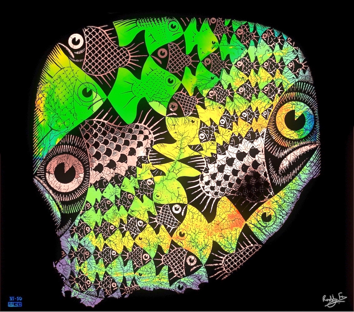 MC Escher produced his famous Fish and Scales print in 1950 – at the same time as The Butterflies. And so, following on from my re-imagination of The Butterflies in yesterday’s post, I’ve used the same method to produce the Fish and Scales Topographic Map of South Africa. You should be able to pick out the country’s coastline easily. The north-eastern edge of Escher’s print follows the curves of the Limpopo River whilst in the north-west it follows the Orange. I’d like to think that he would appreciate the playful colouring!