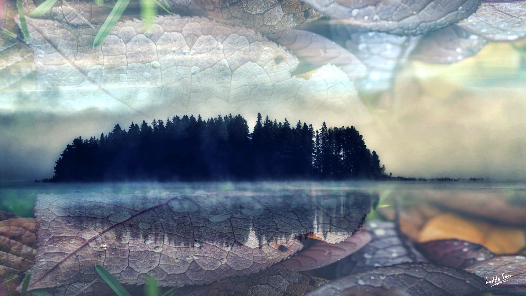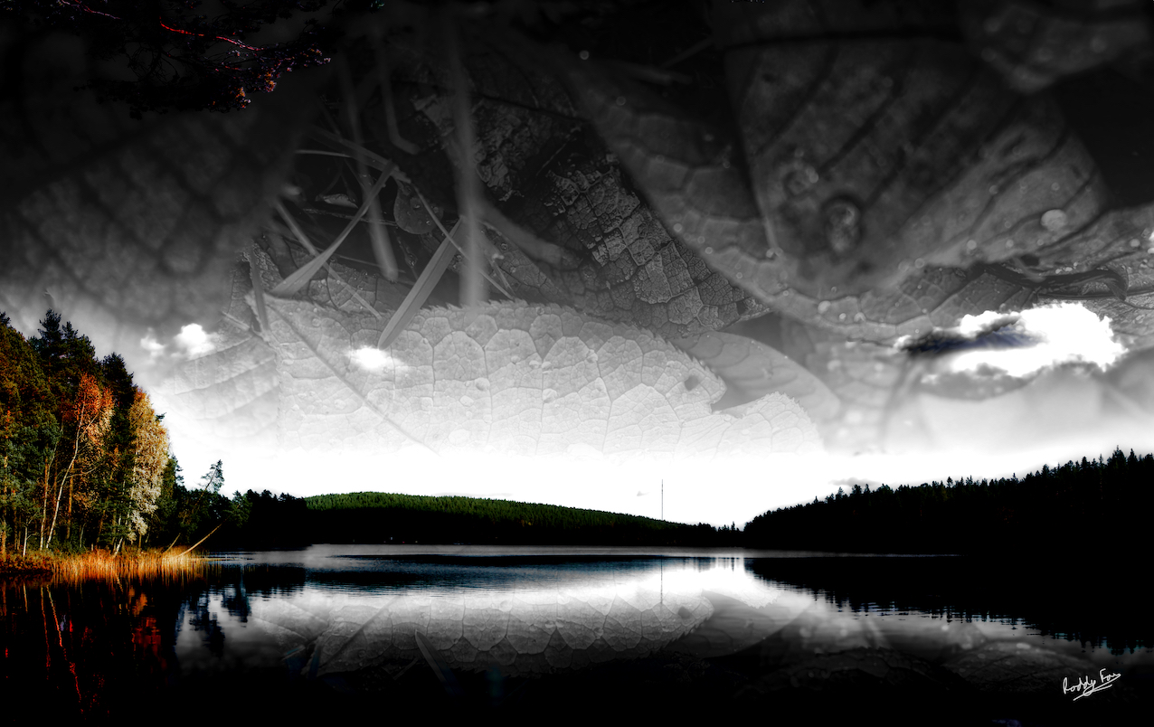 I’ve overlaid the same image – of leaves on the forest floor – on top of three different lake-scapes near Falun: at Korsgården, Svärdsjön and Stångtjärn. The forest floor is pictured with a very shallow depth of field so when overlain above and below the horizon line it draws you into the reflected tree-scape.