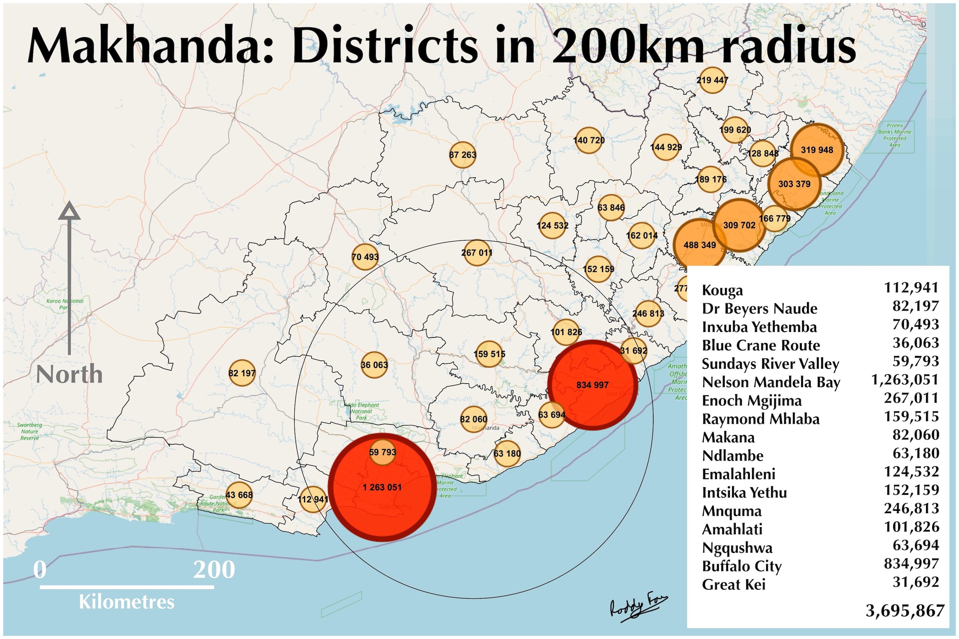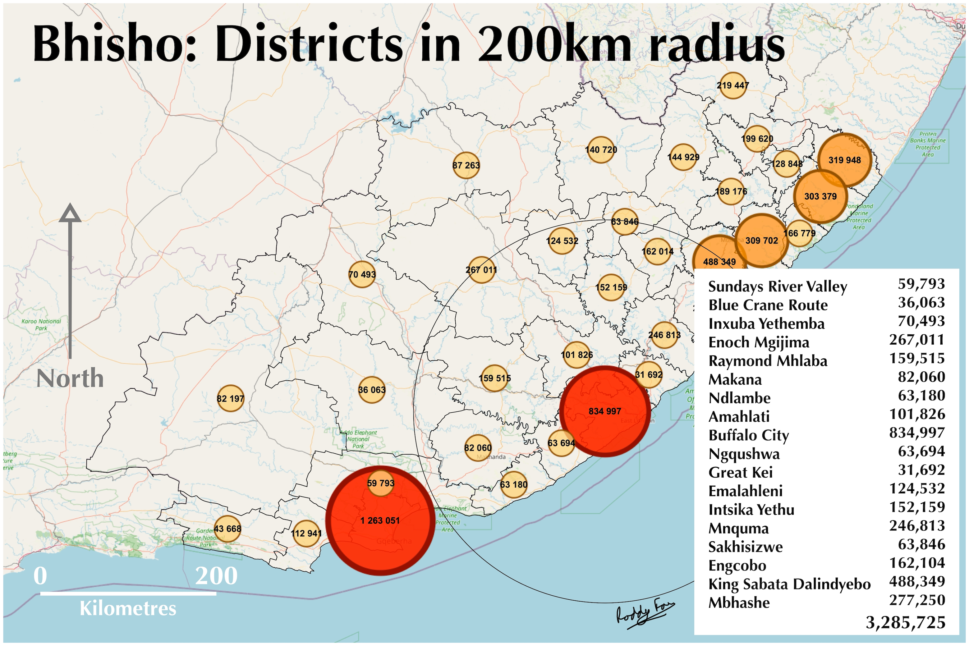 When we look at just how many districts lie either wholly or in part within 200kms the first map shows that Makhanda serves 17 districts – including the Province’s two metropoles – with a combined population of 3,695,867. The second map shows that Bhisho serves 18 districts – but only one metropole – and so their combined population is lower at 3,285,725.