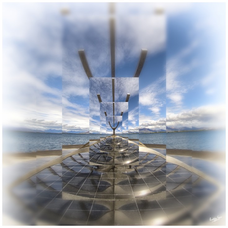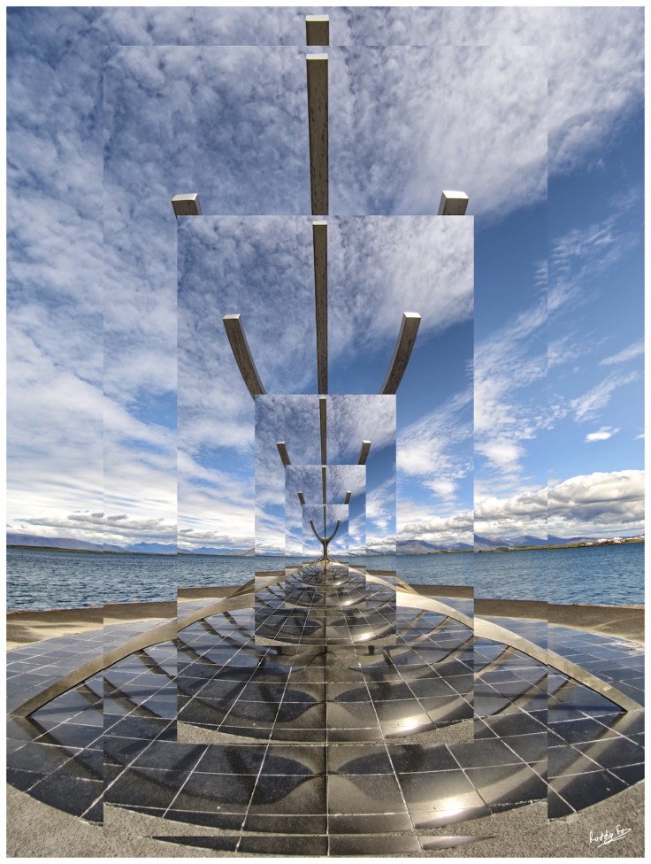 I copied the image several times and each time I made it ever smaller. Then I superimposed them one on top of the other to give the impression that the ship launches out across the fjord towards Mount Esja and into a land of dreams. Without knowing it I was following the intention of the sculpture: the Wikipedia entry says “Sun Voyager is described as a dreamboat, or an ode to the Sun. The artist intended it to convey the promise of undiscovered territory, a dream of hope, progress and freedom.”