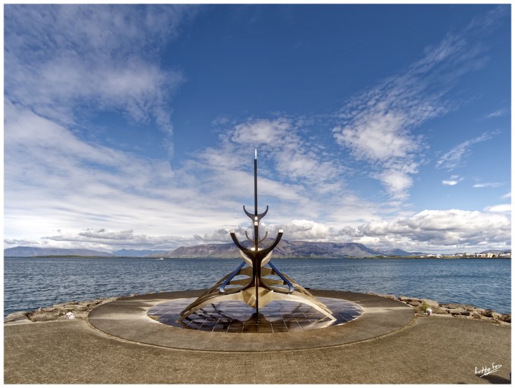 I say revisited because my first shot of Sólfar was way back in 2013 when we were in Reykjavik for a conference. We had attended a late concert at Harpa and were walking along Sæbraut Road enjoying the grey light over the fjord. We stopped to admire Sólfar (the Sun Voyager) – as most people do – and the picture I took then was for many years my portrait image on WhatsApp. This was before WhatsApp was bought out by Meta. These new images were all taken in early July 2025 – on the last day of our wonderful time in Iceland – when we were taken back to photograph Sólfar and Harpa by Árni and Rut (at our request).